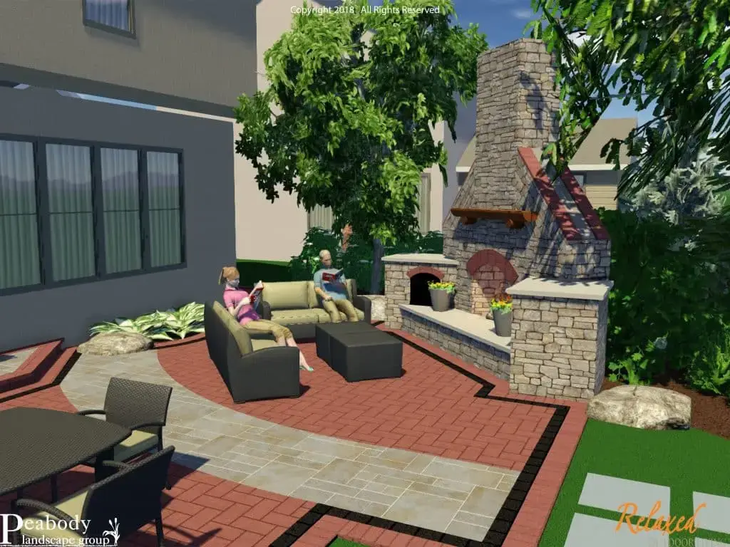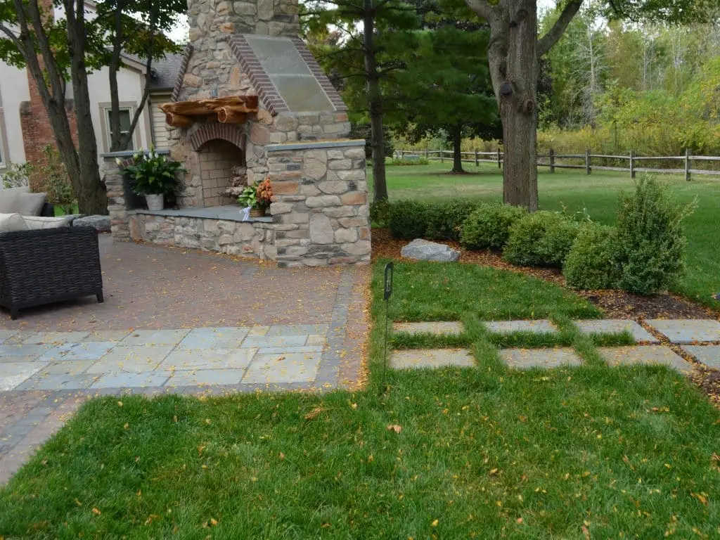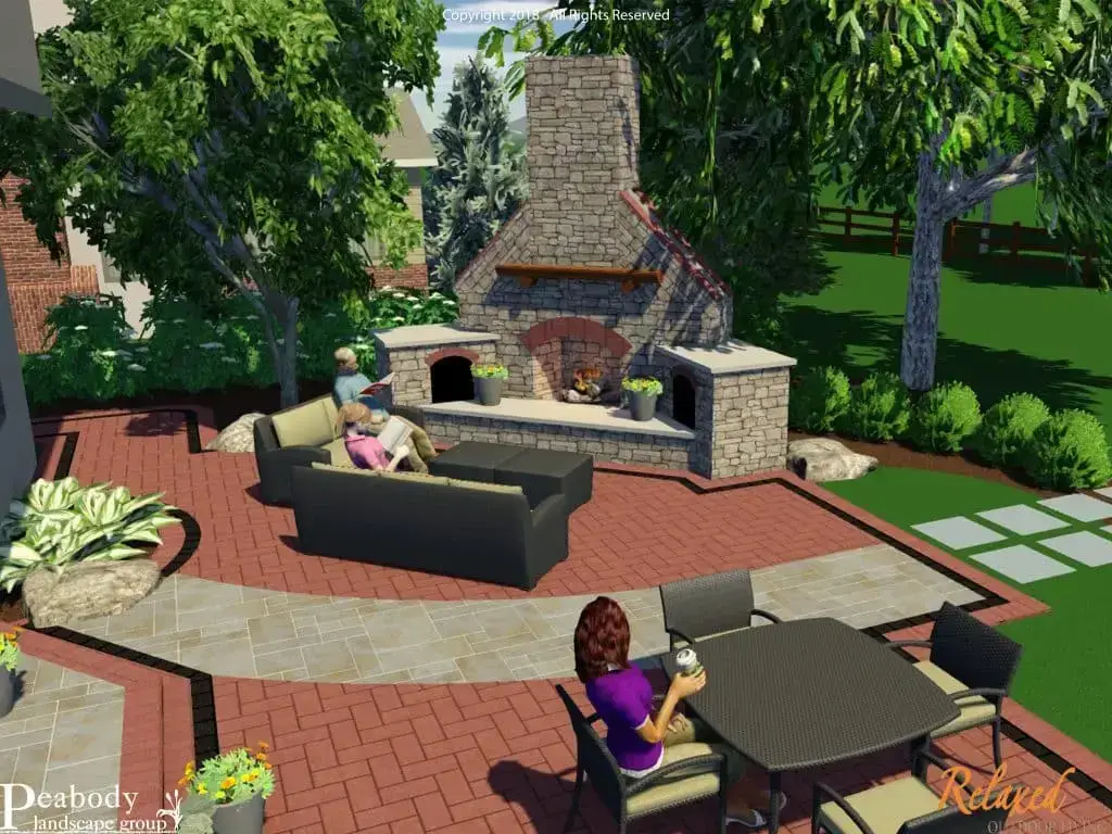 The rustic natural appeal of this fireplace and patio makes for a relaxed lake house feel to this project. The use of multiple materials divides the space into rooms and creates a visual walkway through the patio. The built-in grill and high-top bar add extra seating or a great place to keep an eye on the cook!